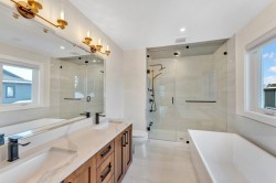 This stunning property offers a perfect blend of comfort and elegance, ideal for modern family living and a bonus mortgage helper if wanted. The spacious family room features bi-fold doors opening to a covered patio with a gas hookup, perfect for entertaining. The gourmet kitchen boasts Fisher Paykel appliances, a gas cooktop with a pot filler, and a walk-in pantry. The main floor also includes a guest bedroom and bathroom. The primary bed features a large walk-in closet and a spa-like ensuite with dual vanity, steam shower, and soaker tub. Upstairs, enjoy a spacious balcony with a gas hookup and water line. The third floor has a huge rec room with vaulted ceilings and an additional full bath. Includes A/C, HRV, radiant in-floor heating, and more.