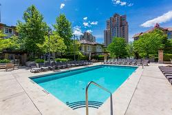 KELOWNA'S MOST VIBRANT & EXCITING LOCATION - HERONS AT WATERSCAPES! You'll be mesmerized by the shimmering waters of the outdoor pool, green foliage, & privacy. This elegant, freshly RENOVATED, 1 bedroom PLUS LARGE DEN, 3rd floor suite offers ONLY 1 NEIGHBOUR and comes fully equipped to allure you into resort style living. The kitchen is designed with NEW cabinets that extend to the ceiling, and QUARTZ counter tops. The layout supports open concept-living coupled with the dining area and living room. The Primary Bedroom offers a sizable 4pc cheater ensuite. A covered west-facing deck facilitates BBQ-ing and people watching overlooking the inner courtyard. This floor plan also furnishes a sizable den for an office or futton. Suite 333 IS LIKE NEW boasting durable vinyl plank flooring, newly painted, upgraded light fixtures and new cabinetry and quartz counters throughout! The unit is mere steps from Okanagan Lake / TUGBOAT BAY and a quick stroll to craft breweries, restaurants, Prospera Place and the Cultural District of the revitalized downtown. The resort features the remodeled Cascade Club, a 4000 sq.ft. amenity with swimming pool, 2 hot tubs, barbeque area, yoga and fitness rooms, billiards room, putting green and library. RENTALS PERMITTED | PET FRIENDLY with restrictions | 1 U/G STALL & STORAGE LOCKER | QUICK POSSESSION!!!!!!!!