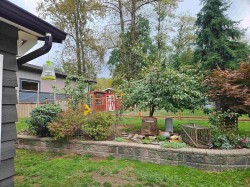 QUARTER ACRE LOT on quiet, no-thru street, this lovely home has so much character with updates including; electrical, newer windows, flooring, silestone counter tops, h/w tank, washer/dryer, gas f/p, upgraded water line from city hookup. The roof, huge back deck and refreshed modern exterior paint were done in 2024 and new septic (tank/field) & perimeter drains in 2015. The spacious bedrooms, large living spaces and vaulted ceiling give the home an open & airy feel. The 17X11 attached storage/workshop could be livingspace! This home offers multiple outbuildings including; 2 sheds; greenhouse; carport 25'x12' & RV pkg. Outside is a gardeners dream with loads of mature shrub/trees, vegetable gardens, fully fenced yard for kids/pets, front/back decks perfect for entertaining.