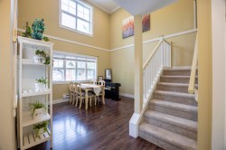 AWESOME! DON'T MISS THIS RARE & GORGEOUS END UNIT, 2 LEVEL TOWNHOUSE WITH 2 CAR GARAGE WITH FRONT DRIVEWAY FOR 1 MORE PARKING SPOT AND DOUBLE HEIGHT CEILING IN LIVING ROOM. 3 LARGE SPACIOUS BEDROOMS AND 3 BATHROOMS. MAIN FLOOR HAS A OPEN LAYOUT WITH LARGE ROOMS, LIVING ROOM, DINNING ROOM, FAMILY ROOM, A GORGEOUS GOURMET KITCHEN WITH GRANITE COUNTERTOPS ON THE HOME. STAINLESS-STEEL APPLIANCES WITH LARGE ISLAND. And directly accessible to community play ground, 3 MIN from GOLDEN EARS ELEMENTARY, Thomas HANEY high School.