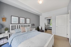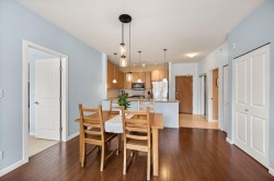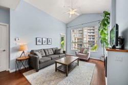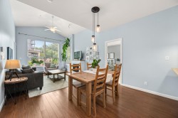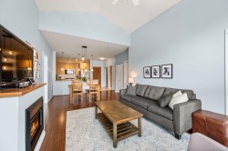 Elevated Living in Victoria Hill – A Rare Top Floor Retreat! Welcome to The Grove, this west-facing top floor level 2 bed, 2 bath home boasts soaring 12ft vaulted living room ceilings and oversized windows, filling the open-concept space with warm southwest light. The stylish kitchen features granite counters, stainless steel appliances, and sleek cabinetry, while the split-bedroom layout offers maximum privacy with two walk-in closets. Laminate floors flow through the bright living/dining area with upgraded lighting, opening to a sunny balcony. Immaculate condition with in-suite laundry (new modern washer/dryer), 2 parking stalls & storage. Exceptional amenities with full gym, theatre, lounge, library, basketball court & more. Steps to Queens Park, shops, dining, SkyTrain & transit.