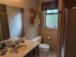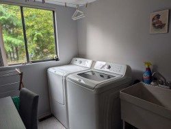 For more information, click the Brochure button. A 5,400 sq ft custom designed home and nearly 11,000 sq ft property is quietly situated on the end of a no-through-road in central Lynn Valley. At the back of the property is a place to find inner peace by the “zen-like” babbling water of Thames Creek. Cross over the Thames Creek and you will enter the trails of forested Doran Park. Enter the front door of this home and you will notice the solid oak ship-deck flooring, the sunken living room, the soaring stone fireplace and the vaulted sky lit ceilings. The dining room has access to a south facing deck. The kitchen and family room have access to a much larger (370 sq ft) two level east facing deck over looking Thames Creek and Doran Park. This deck also has an outdoor brick BBQ fireplace.