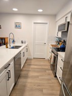 This rear-facing, first floor corner unit has a great layout with a generous bedroom and full bathroom on each side of the central living room. As you enter, you will find the beautiful bright kitchen with adjacent large pantry featuring a large quartz island with seating and open to the living room and dining area making it perfect for entertaining company. The primary bedroom with a large walkthrough closet leads to a 4-piece ensuite. Other attractive features are the large covered balcony, convenient in-suite laundry, vinyl plank flooring throughout as well as all newer appliances. This unit also includes one underground parking space. All of this conveniently located close to shopping amenities, UNBC and walking trails! Verify measurements if important.