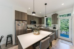 PRIME SQUAMISH DENTVILLE LOCATION! This bright 2BR townhome backs onto peaceful greenspace yet steps from downtown core. Perfect for outdoor enthusiasts & families - walk to schools, shops, trails & brand-new playground! Open-concept living w/ 9ft ceilings, modern finishes, kitchen island & private tree-surrounded patio. XL single car garage also has room to fit all your gear + bikes. Add'l carport parking too for 2nd vehicle. Feat stainless appliances, large windows, east-facing balcony and patio overlooking greenbelt and offering privacy. Newport Landing offers the best of both worlds - convenient urban amenities without the hustle! Efficient layout, powder room main floor, 2BR up. Ready for Squamish mountain lifestyle! Open House - 2-4pm Nov 15th, 2025.