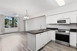 Stunning, renovated Top Floor home in Fleetwood Gardens a 55+ centrally located building.2 bedroom + den, with 2 full bathrooms, in-suite laundry, secure parking for 1 vehicle, boasting over 1000 sqft of functional living space. Natural light fills this North facing home with 9 foot ceilings and large windows overlooking trees for a picturesque setting. Home in immaculate condition with recent upgrades including vinyl plank floor, lighting, kitchen/bathroom cupboards, quartz counter tops, newer appliances including induction stove! Large primary bedroom with his & hers closet and ensuite with tub. Relax & enjoy mountain views from your large covered patio. Just minutes walk from Fleetwood Community Centre, parks, grocery stores, restaurants, and transit. Quick Possession possible!