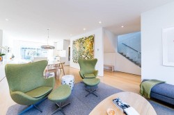 Spread out in this luxurious 3000 sq. ft. furnished house in Vancouver's Kitsilano. This house's main two levels rental offers 3 bedrooms, a den, a loft space, 2.5 bathrooms, 3+ balconies, and a private garden area. Relax in the modernly furnished living room with plenty of windows and a gas fireplace. Note the incredible hardwood flooring throughout the open floor-plan, which takes you from the living space through to the dining area with plenty of seating and beautiful art pieces. The kitchen looks out to private outdoor space and features a huge island, stainless steel appliances, and caesarstone countertops. There is plenty of cabinetry storage as well as a large pantry.