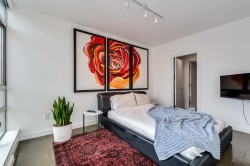 Stunning fully renovated loft style 925 sqft with a 91 sqft patio, view this 2 bedroom 2 bathroom condo at this luxurious property called V6A. Move into this trendy & diverse neighbourhood. Sleek modern renovation in 2023, features include, white cabinetry, sleek black hardware, marble countertops, white carrara marble blacksplash, SS full sized appliances, motorized blinds throughout, sleek open-concept design, polished concrete floor. It also has a 71 inch bath tub in the master ensuite, dimmer switches & more. V6a has a concierge service, fully equipped fitness centre with state-of-the-art cardio equipment & free weights.