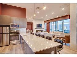 Discover contemporary urban living in this sun-filled one-bedroom + den condo with unobstructed Lake views from the spacious balcony. Perfect for professionals, couples, or those seeking extra space for a home office, guests, or a small hobby room. The open-concept living area invites natural light from large windows, creating a bright and welcoming atmosphere. The flexible den can function as a home office, media room, or guest space, adapting to your changing needs. Two bathrooms provide convenience and privacy, with a primary ensuite and a stylish second bathroom for guests. The modern kitchen features stainless steel appliances, ample cabinetry and counter space, making meal prep and entertaining effortless. The primary suite offers a comfortable retreat with generous closet space and a tranquil ambiance, overlooking the lake.Within the building, residents enjoy a range of amenities designed to support an active, social lifestyle. A fully equipped gym allows you to stay fit without leaving the premises, while the games room offers a relaxed space to unwind with friends or family. The party room is ideal for hosting gatherings and celebrations, providing a convenient venue for entertaining guests. On-site visitor parking adds peace of mind for hosting friends and family, ensuring convenience for you and your guests.Located in a vibrant urban neighborhood, this condo offers easy access to public transit and major highways, dining, shopping, and more. The building is well-maintained and professionally managed, contributing to a secure and comfortable living environment. This is an excellent choice for urban dwellers seeking convenience, security, and modern comfort in a high-quality residence.