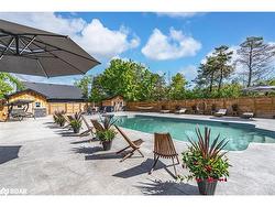 LUXURY INSIDE, PARADISE OUTSIDE - THIS ONE WAS MADE TO ENTERTAIN! Live the lifestyle you’ve been dreaming of in this extraordinary home, set on a fully fenced 0.72-acre lot just off Highway 11 with quick access to downtown Barrie in 15 minutes and Orillia in 20. Enjoy year-round recreation with Lake Simcoe’s waterfront only 6 minutes away, nearby golf courses, scenic forest trails, and Snow Valley Ski Resort just 30 minutes from your door. Behind the secure gated entry with keypad access and motion sensors, the professionally landscaped grounds showcase luxurious armour stone, a 9 x 12 ft front deck, a newly paved driveway, and a heated triple garage and workshop with full insulation, gas service, and automatic door openers. The backyard oasis is built for entertaining with a 20 x 40 ft saltwater pool, stamped concrete surround, two powered cabanas with change rooms, and a covered bar with epoxy counters, a built-in fridge, BBQ hookup, ceiling fan, and a seasonal sink. Inside, the fully renovated main level offers high-end finishes and open-concept living, with a designer kitchen boasting quartz counters, upgraded appliances, and a walkout to the poolside patio. The bathroom features a quartz vanity and glass-enclosed tiled shower, while the primary bedroom includes a cedar walk-in closet, with the option to convert the dining room into a third bedroom if desired. Added highlights include main-floor laundry, California shutters, and an engineered hardwood staircase with custom black rod railings. The finished basement adds a spacious family room with a gas fireplace and built-in shelving, a guest bedroom, office nook, and premium mechanical upgrades including a gas furnace, pressure pump, water softener, three sump pumps, and an owned hot water tank. Don’t miss your chance to own this exceptional retreat - where high-end finishes meet unmatched outdoor luxury, creating the ultimate space to relax, entertain, and make every day feel like a getaway.
