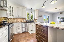 Welcome to this 2015 Parkview-built bungalow featuring four bedrooms and three bathrooms. The open-concept main level offers a bright and functional layout with living, dining, and kitchen areas seamlessly connected. The kitchen is highlighted by granite countertops, a center island, and a built-in double-door dishwasher. French doors lead from the dining area to the back deck, complete with a natural gas hookup for barbecues and outdoor entertaining. Engineered hardwood flooring runs throughout the main level. The spacious primary bedroom includes an oversized closet and is served by a beautifully appointed 4-piece bath with stand-up shower, soaker tub, and vanity. A 2-piece bath and convenient main floor laundry complete this level. The fully finished basement provides excellent additional living space with a large rec room featuring laminate flooring and a natural gas fireplace with thermostat. Two additional bedrooms, a 3-piece bath with shower, a workshop, and utility room offer plenty of versatility and function for family or guests. Outside, enjoy a detached single-car garage with attached 8 garden shed, a fully fenced backyard, paved driveway, and ample parking. This well-maintained home is move-in ready and offers comfort, style, and space inside and out. Only 35 min drive to the west end of Ottawa and 40 mins to Barrhaven. (id:27)